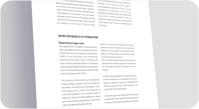 MANAGEMENT REPORT Overall assessment of expected performance The COVID-19 crisis continues to overshadow the economic planning for some time to come. economic activities of German companies, forcing Borussia Dortmund will persevere through these them to confront the major challenge of having to still difficult times thanks to the economically sound operate in a highly uncertain environment. Borussia foundation it has built up and the specific Dortmund also expects to face significant economic countermeasures it has taken. There is a high restrictions in the coming period. Even if infection forecasting risk stemming from the strong rates in Germany are currently at a stable low level dependence on political decisions and the further and progress is being made in the vaccination course of the COVID-19 pandemic. Thus, any campaign, there remains an ever-present risk that statements regarding the future performance of infections will flare up and tougher restrictions will the Company remain subject to a high degree of be imposed to control them. This will shape uncertainty. EXPECTED RESULTS OF OPERATIONS Expected earnings trend Despite the economic uncertainties and a more The ongoing COVID-19 pandemic continues to pose subdued transfer market, Borussia Dortmund major challenges for Germany and the world. The expects there to be some very lucrative transfer number one priority is containing the spread of the deals in the offing, setting up net transfer income COVID-19 virus in all facets of life. Professional as a significant earnings driver. football must also play its part in overcoming the The club traditionally pursues a more conservative crisis. Borussia Dortmund GmbH & Co. KGaA also approach when factoring success on the pitch and remains heavily affected. Therefore, the expectation any associated earnings contributions into the is of further severe adverse effects on the earnings forecast. trend in financial year 2021/2022. In light of the high degree of uncertainty related to The projection is that matches will be played to all sales categories, the management currently limited spectator numbers in the first half of the expects to generate a net loss of between EUR new season, with the second half seeing a return 14,000 thousand and EUR 19,000 thousand in the to full capacity. As a result of the measures to coming 2021/2022 financial year. contain the pandemic, only a limited number of tickets will initially be made available per match, In this planning scenario, the result from operating which will continue to weigh heavily on income from activities (EBIT) will exceed the forecast net loss for match operations and public catering. the year by the financial result and tax expense of 81