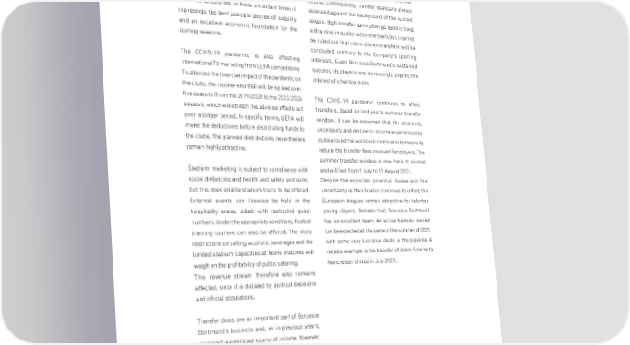 BORUSSIA DORTMUNDGmbH & Co. Kommanditgesellschaft auf Aktien, Dortmund Sundays. Football will also return to free-to-air environment, Borussia Dortmund on principle only TV after a 17-year hiatus, with ProSieben/Sat1 takes transfer income into limited account in its acquiring the broadcasting rights to a total of nine planning. The transfer policy nevertheless presents live matches. Even though the agreement fell significant opportunities to generate substantial somewhat short of expectations with a decline in income. Consequently, transfer deals are always volume of around 5%, in these uncertain times it assessed against the background of the current represents the best possible degree of stability season. High transfer sums often go hand in hand and an excellent economic foundation for the with a drop in quality within the team, but it cannot coming seasons. be ruled out that value-driven transfers will be concluded contrary to the Company's sporting The COVID-19 pandemic is also affecting interests. Given Borussia Dortmund's sustained international TV marketing from UEFA competitions. success, its players are increasingly piquing the To alleviate the financial impact of the pandemic on interest of other top clubs. the clubs, the income shortfall will be spread over five seasons (from the 2019/2020 to the 2023/2024 The COVID-19 pandemic continues to affect season), which will stretch the adverse effects out transfers. Based on last year's summer transfer over a longer period. In specific terms, UEFA will window, it can be assumed that the economic make the deductions before distributing funds to uncertainty and decline in income experienced by the clubs. The planned distributions nevertheless clubs around the world will continue to temporarily remain highly attractive. reduce the transfer fees received for players. The summer transfer window is now back to normal Stadium marketing is subject to compliance with and will last from 1 July to 31 August 2021. social distancing and health and safety protocols, Despite the expected potential losses and the but this does enable stadium tours to be offered. uncertainty as the situation continues to unfold, the External events can likewise be held in the European leagues remain attractive for talented hospitality areas, albeit with restricted guest young players. Besides that, Borussia Dortmund numbers. Under the appropriate conditions, football has an excellent team. An active transfer market training courses can also be offered. The likely can be expected all the same in the summer of 2021, restrictions on selling alcoholic beverages and the with some very lucrative deals in the pipeline. A limited stadium capacities at home matches will notable example is the transfer of Jadon Sancho to weigh on the profitability of public catering. Manchester United in July 2021. This revenue stream therefore also remains affected, since it is dictated by political decisions and official stipulations. Transfer deals are an important part of Borussia Dortmund's business and, as in previous years, represent a significant source of income. However, in view of the developments in the economic 168