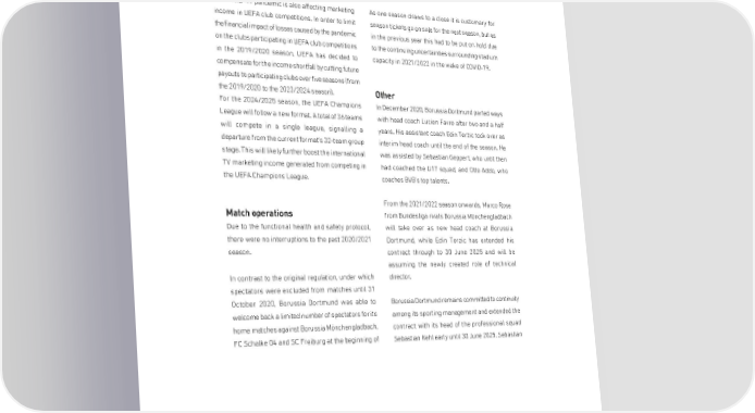 GROUP MANAGEMENT REPORT Nevertheless, a season without interruptions and the season. All subsequent home matches had to be timely payments by partners in line with their played behind closed doors due to the pandemic. contracts are essential for ensuring the amount and This had a massive impact on the earnings potential timing of the distribution payouts. of match operations. The COVID-19 pandemic is also affecting marketing As one season draws to a close it is customary for income in UEFA club competitions. In order to limit season tickets go on sale for the next season, but as the financial impact of losses caused by the pandemic in the previous year this had to be put on hold due on the clubs participating in UEFA club competitions to the continuing uncertainties surrounding stadium in the 2019/2020 season, UEFA has decided to capacity in 2021/2022 in the wake of COVID-19. compensate for the income shortfall by cutting future payouts to participating clubs over five seasons (from the 2019/2020 to the 2023/2024 season). Other For the 2024/2025 season, the UEFA Champions In December 2020, Borussia Dortmund parted ways League will follow a new format. A total of 36 teams with head coach Lucien Favre after two and a half will compete in a single league, signalling a years. His assistant coach Edin Terzic took over as departure from the current format's 32-team group interim head coach until the end of the season. He stage. This will likely further boost the international was assisted by Sebastian Geppert, who until then TV marketing income generated from competing in had coached the U17 squad, and Otto Addo, who the UEFA Champions League. coaches BVB's top talents. From the 2021/2022 season onwards, Marco Rose Match oper ations from Bundesliga rivals Borussia Mönchengladbach Due to the functional health and safety protocol, will take over as new head coach at Borussia there were no interruptions to the past 2020/2021 Dortmund, while Edin Terzic has extended his season. contract through to 30 June 2025 and will be assuming the newly created role of technical In contrast to the original regulation, under which director. spectators were excluded from matches until 31 October 2020, Borussia Dortmund was able to Borussia Dortmund remains committed to continuity welcome back a limited number of spectators for its among its sporting management and extended the home matches against Borussia Mönchengladbach, contract with its head of the professional squad FC Schalke 04 and SC Freiburg at the beginning of Sebastian Kehl early until 30 June 2025. Sebastian 3rdmatch day UCL 7th match day 4 November 2020 7 November 2020 FC Brügge - BVB 0:3 BVB - Bayern München 2:3 125