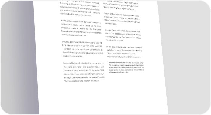 BORUSSIA DORTMUNDGmbH & Co. Kommanditgesellschaft auf Aktien, Dortmund Kehl will take over from Michael Zorc as sporting On the other hand, Thomas Treß and Carsten director from 1 July 2022. Borussia Dortmund also Cramer, whose contracts were set to expire on 30 extended the contract with its youth academy June 2022, each signed early extensions until 30 director Lars Ricken early until 30 June 2025. June 2025. Thomas Treß will remain responsible for "Finance", "Organisation", "Legal" and "Investor Beginning in the 2021/2022 season, Borussia Relations". Carsten Cramer is responsible for the Dortmund will have a women's team. Instead of "Sales & Marketing" and "Digitisation" areas. acquiring the licence of another professional club we are organically developing and promoting Twelve of Europe's top clubs launched a new women's football from within our club. breakaway "Super League" to compete with the UEFA Champions League, only to cancel this project A total of ten players from Borussia Dortmund's mere days later. professional squad were called up to their respective national teams for the European In early September 2020, Borussia Dortmund Championship, including Germany internationals started live streaming on BVB's official Twitch Mats Hummels and Emre Can. channel. YouTube star Erné "FeelFIFA" Embeli hosts the interactive program. Borussia Dortmund lifted the DFB Cup for the fifth time after victories in 1965, 1989, 2012 and 2017. In the past financial year, Borussia Dortmund The team put on a sensational performance to published its fourth Sustainability Report entitled defeat RB Leipzig 4:1 in the final, which was held at "United in solidarity. No matter what." at Berlin's Olympiastadion. https://verantwortung.bvb.de/2020/en/home-en/.* Borussia Dortmund extended the contracts of its * The content accessible via the link does not constitute part of this management report. In accordance with the statutory managing directors. Hans-Joachim Watzke will requirements, KPMG AG Wirtschaftsprüfungsgesellschaft has continue to serve as CEO until 31 December 2025 neither audited the cross-references nor the information to and remains responsible for setting the Company's which the cross-references refer. strategic course, as well as for the areas of "Sports", "Communications" and "Human Resources". 8th match day 4th match day UCL 21 November 2020 24 November 2020 Hertha BSC - BVB 2:5 BVB - FC Brügge 3:0 126 126