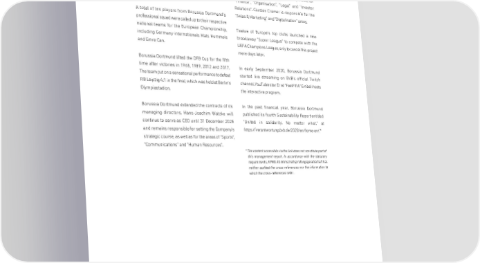BORUSSIA DORTMUNDGmbH & Co. Kommanditgesellschaft auf Aktien, Dortmund Beginning in the 2021/2022 season, Borussia On the other hand, Thomas Treß and Carsten Dortmund will have a women's team. Instead of Cramer, whose contracts were set to expire on 30 acquiring the licence of another professional club June 2022, each signed early extensions until 30 we are organically developing and promoting June 2025. Thomas Treß will remain responsible for women's football from within our club. "Finance", "Organisation", "Legal" and "Investor Relations". Carsten Cramer is responsible for the A total of ten players from Borussia Dortmund's "Sales & Marketing" and "Digitalisation" areas. professional squad were called up to their respective national teams for the European Championship, Twelve of Europe's top clubs launched a new including Germany internationals Mats Hummels breakaway "Super League" to compete with the and Emre Can. UEFA Champions League, only to cancel this project mere days later. Borussia Dortmund lifted the DFB Cup for the fifth time after victories in 1965, 1989, 2012 and 2017. In early September 2020, Borussia Dortmund The team put on a sensational performance to defeat started live streaming on BVB's official Twitch RB Leipzig 4:1 in the final, which was held at Berlin's channel. YouTube star Erné "FeelFIFA" Embeli hosts Olympiastadion. the interactive program. Borussia Dortmund extended the contracts of its In the past financial year, Borussia Dortmund managing directors. Hans-Joachim Watzke will published its fourth Sustainability Report entitled continue to serve as CEO until 31 December 2025 "United in solidarity. No matter what." at and remains responsible for setting the Company's https://verantwortung.bvb.de/2020/en/home-en/.* strategic course, as well as for the areas of "Sports", "Communications" and "Human Resources". * The content accessible via the link does not constitute part of this management report. In accordance with the statutory requirements, KPMG AG Wirtschaftsprüfungsgesellschaft has neither audited the cross-references nor the information to which the cross-references refer. 40