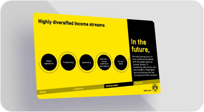Highly diversified income streams In the future, the core business will re- Merchan- main professional football Match TV Marketing Advertising dising/ Transfer with its classic pillars of operations conference deals income: Games, TV and catering marketing, advertising, retail, and transfers. These goals serve as the basis for the management of the company.