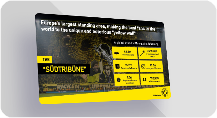 Europe’s largest standing area, making the best fans in the world to the unique and notorious “yellow wall” A global brand with a global following 42.2m Rank #14 Total followers In European total reach THE 15.2m 15.5m Facebook followers Instagram followers “SÜDTRIBÜNE” 1.0m 152,000 Registered users club members worldwide