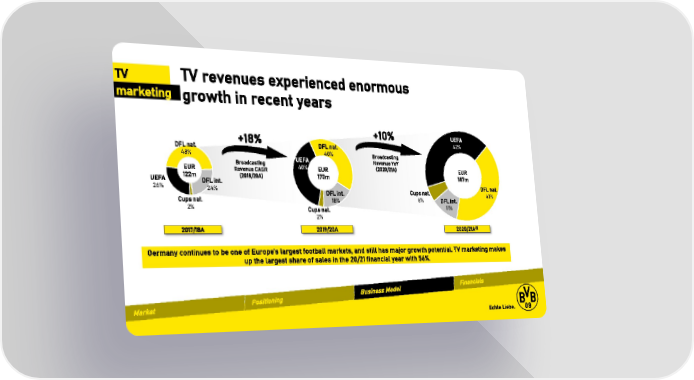 TV TV revenues experienced enormous marketing growth in recent years +10% UEFA +18% DFL nat. 42% DFL nat. 40% 48% UEFA Broadcasting Broadcasting Revenue YoY EUR Revenue CAGR 40% EUR (2020/21A) EUR UEFA 122m DFL int. (2018/20A) 170m 187m 26% 24% Cups nat. DFL nat. DFL int. 41% Cups nat. 18% 6% DFL int. 2% Cups nat. 11% 2% 2017/18A 2019/20A 2020/21A(1) Germany continues to be one of Europe’s largest football markets, and still has major growth potential. TV marketing makes up the largest share of sales in the 20/21 financial year with 56%.