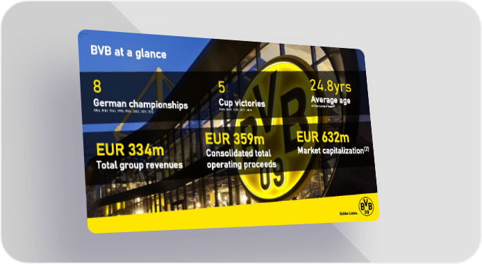BVB at a glance 8 5 24.8yrs Average age German championships Cup victories of the current team(1) 1965, 1989, 2012, 2017, 2021 1956, 1957, 1963, 1995, 1996, 2002, 2011, 2012 EUR 359m EUR 632m EUR 334m Consolidated total Market capitalization(2) Total group revenues operating proceeds