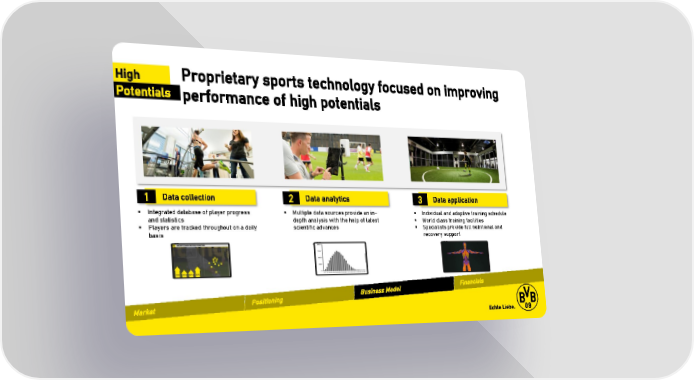 High Proprietary sports technology focused on improving Potentials performance of high potentials 1 Data collection 2 Data analytics 3 Data application ▪ Integrated database of player progress ▪ Multiple data sources provide an in- ▪ Individual and adaptive training schedule and statistics depth analysis with the help of latest ▪ World class training facilities ▪ Players are tracked throughout on a daily scientific advances ▪ Specialists provide full nutritional and basis recovery support