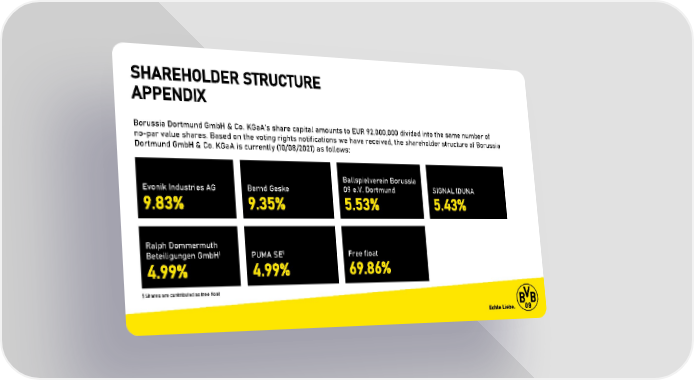 SHAREHOLDER STRUCTURE APPENDIX Borussia Dortmund GmbH & Co. KGaA’s share capital amounts to EUR 92,000,000 divided into the same number of no-par value shares. Based on the voting rights notifications we have received, the shareholder structure of Borussia Dortmund GmbH & Co. KGaA is currently (10/08/2021) as follows: Ballspielverein Borussia Evonik Industries AG Bernd Geske 09 e.V. Dortmund SIGNAL IDUNA 9.83% 9.35% 5.53% 5.43% Ralph Dommermuth Beteiligungen GmbH1 PUMA SE1 Free float 4.99% 4.99% 69.86% 1 Shares are contributed as free float