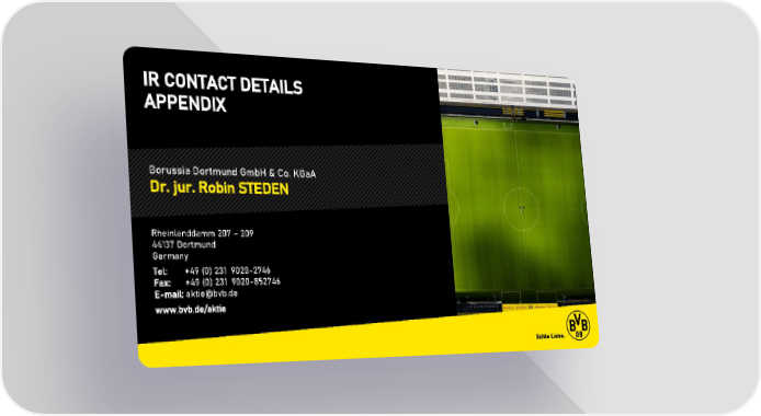 IR CONTACT DETAILS APPENDIX Borussia Dortmund GmbH & Co. KGaA Dr. jur. Robin STEDEN Rheinlanddamm207 –209 44137 Dortmund Germany Tel: +49 (0) 231 9020-2746 Fax: +49 (0) 231 9020-852746 E-mail: aktie@bvb.de www.bvb.de/aktie