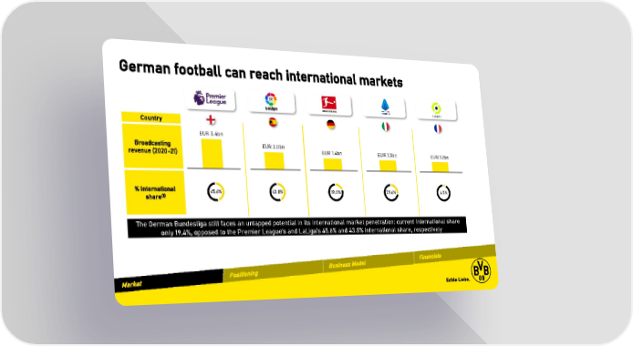 German football can reach international markets Country EUR 3.4bn Broadcasting EUR 2.0bn revenue (2020-21) EUR 1.4bn EUR 1.3bn EUR 1.2bn % international 45.6% 43.8% 19.4% 27.6% 6.5% share(1) The German Bundesliga still faces an untapped potential in its international market penetration: current international share only 19.4%, opposed to the Premier League’s and LaLiga’s 45.6% and 43.8% international share, respectively