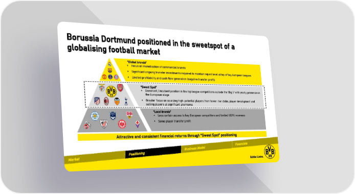 Borussia Dortmund positioned in the sweetspot of a globalising football market “Global brands” ▪ Focus on monetisation of commercial brands ▪ Significant ongoing transfer investments required to maintain squad level at top of key European leagues ▪ Limited profitability and cash flow generation (negative transfer profit) “Sweet Spot” ▪ Dominant / incubent position in the top league competitions outside the ‘Big 5‘ with yearly presence on the European stage ▪ Greater focus on sourcing high-potential players from lower-tier clubs, player development and selling players at significant premiums “Local brands” ▪ Less certain access to key European competitors and limited UEFA revenues ▪ Some player transfer profit Attractive and consistent financial returns through “Sweet Spot“ positioning