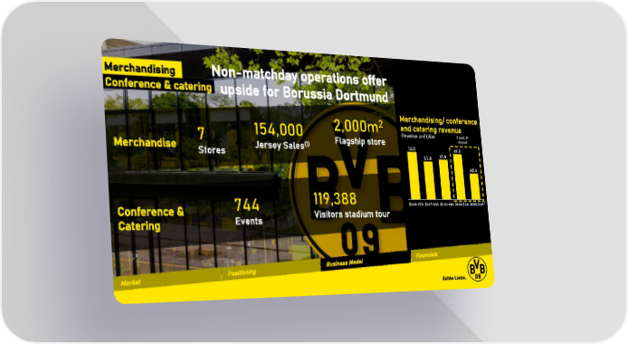 Merchandising Non-matchday operations offer Conference & catering upside for Borussia Dortmund 2 Merchandising/ conference 2,000m and catering revenue 154,000 Revenuein EURm Covid-19 7 Flagship store impact Merchandise Jersey Sales(1) 72.0 69.8 Stores 57.8 61.4 40.4 119,388 (2) Conference & 744 2016/17A 2017/18A 2018/19A 2019/20A 2020/21A Catering Events Visitors stadium tour