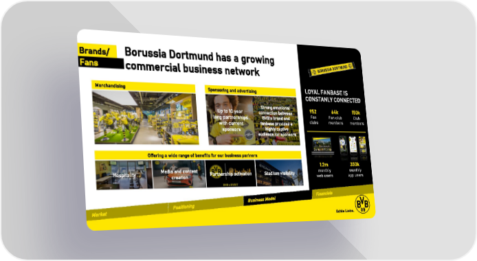 Input to be discussed Borussia Dortmund has a growing e.g. sponsors Brands/ Fans commercial business network Merchandising Sponsoring and advertising LOYAL FANBASE IS CONSTANLY CONNECTED Strong emotional 952 64k 150k Up to 10 year connection between Fan Fan club Club long partnerships BVB’s brand and clubs members members with current fanbase provides a sponsors highly captive audience for sponsors Offering a wide range of benefits for our business partners 1.2m 350k Hospitality Media and content Partnership activation Stadium visibility monthly monthly creation web users app users