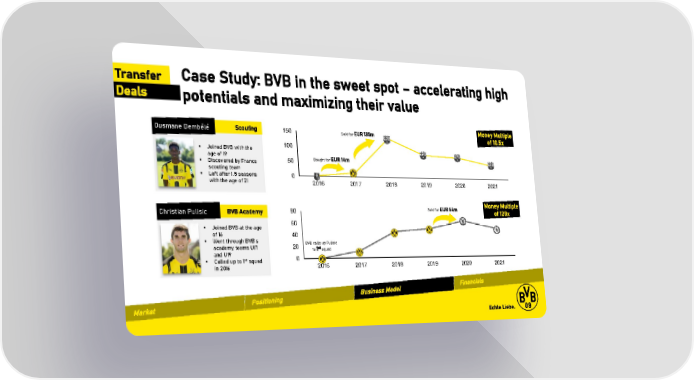 Transfer Case Study: BVB in the sweet spot – accelerating high Deals potentials and maximizing their value Ousmane Dembélé Scouting 150 Sold for EUR 135m Money Multiple of 10.5x ▪ Joined BVB with the 100 age of 19 50 Bought for EUR 14m ▪ Discovered by France scouting team ▪ Left after 1.5 seasons 0 with the age of 21 2016 2017 2018 2019 2020 2021 80 Sold for EUR 64m Money Multiple Christian Pulisic BVB Academy of 128x ▪ Joined BVB at the age 60 of 16 40 ▪ Went through BVB’s 20 BVB calls up Pulisic academy teams U17 to 1st squad and U19 st 0 ▪ Called up to 1 squad 2016 2017 2018 2019 2020 2021 in 2016