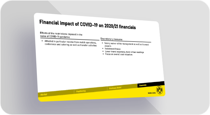Financial impact of COVID-19 on 2020/21 financials Effects of the restrictions imposed in the wake of COVID-19 pandemic Discretionary measures ▪ Affected in particular income from match operations, ▪ Salary waiver of the management as well as licensed conference and catering as well as transfer activities players ▪ Investment freeze ▪ Lower travel expenses, more virtual meetings ▪ Focus on overall cost reduction