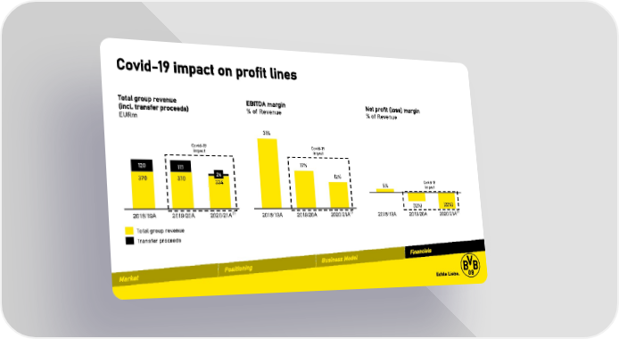 Covid-19 impact on profit lines Total group revenue EBITDA margin Net profit (loss) margin (incl. transfer proceeds) % of Revenue % of Revenue EURm 31% Covid-19 Covid-19 impact impact 120 117 17% 370 370 24 12% 334 5% Covid-19 impact (12%) (22%) (1) (1) (1) 2018/19A 2019/20A 2020/21A 2018/19A 2019/20A 2020/21A 2018/19A 2019/20A 2020/21A Total group revenue Transfer proceeds
