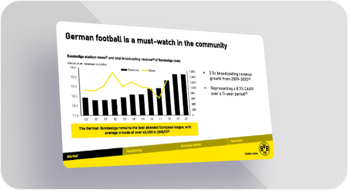 German football is a must-watch in the community (1) (2) Bundesliga stadium views and total broadcasting-revenue of Bundesliga clubs Views in m; revenue in EURm 14.0 Revenue Views 1,600 ▪ 2.5x broadcasting revenue 1,400 growth from 2009-2020(2) 13.5 1,200 13.0 1,000 ▪ Representing a 8.7% CAGR 800 over a 11-year period(2) 12.5 600 12.0 400 200 11.5 0 09' 10' 11' 12' 13' 14' 15' 16' 17' 18' 19' 20' The German Bundesliga remains the best attended European league, with average crowds of over 43,000 in 2018/19(1)