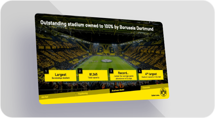 Outstanding stadium owned to 100% by Borussia Dortmund 1 2 3 4 Largest 81,365 Record… 4th largest Bundesliga stadium Total capacity …holder for average game Stadium capacity in Europe attendance in Europe
