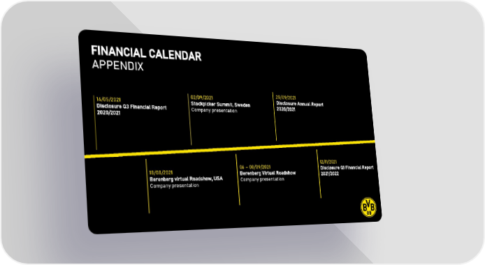 FINANCIAL CALENDAR APPENDIX 02/09/2021 28/09/2021 14/05/2021 Stockpicker Summit, Sweden Disclosure Annual Report Disclosure Q3 Financial Report Company presentation 2020/2021 2020/2021 06 – 08/09/2021 12/11/2021 18/08/2021 Berenberg Virtual Roadshow Disclosure Q1 Financial Report Berenberg virtual Roadshow, USA Company presentation 2021/2022 Company presentation
