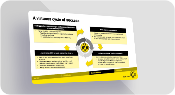 A virtuous cycle of success Leading position in German league facilitates consistent access …drives larger revenue potential… to European competitions… ▪ High probability of UCL participation ▪ Material portion of revenue linked to participation, with − Top 4 Bundesliga teams have a guaranteed place in further upside the UCL group stage ▪ BVB received a total pay-out by UEFA Champions League − #5 goes to the third qualifying round of the UCL of EUR 78.7m in 2020/21 (EUR 67.4m in 2019/20) …maximizing ability to retain and develop players… …and a “shop-window” to entice young talent… ▪ Data-driven and professionalized talent recruitment ▪ Ultimate showcase, attracting global young talent process − European competition exposure serves as the perfect ▪ Highly successful academy with at least two youth “scouting” ground for the ‘Big 5’ league clubs players ready to play in the first team every season − Greater ability to compete for titles and individual ▪ Individual development programmes prizes in the domestic league ▪ Ability to obtain and reacquire players