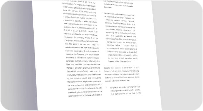 BORUSSIA DORTMUNDGmbH & Co. Kommanditgesellschaft auf Aktien, Dortmund justification to the Code given by the the remuneration system for executive board Government Commission, all of these members and/or executive board pay, and on recommendations are based, either in the role of the Supervisory Board, which in substance or method, on the statutory some respects are considered to be provisions for a German stock corporation over-regulation, have not been and will not be (Aktiengesellschaft) under § 87 (1) of the applied on a voluntary basis by the Executive German Stock Corporation Act (Aktiengesetz, Committee. "AktG") and/or § 87a AktG, which entered into force on 1 January 2020. These statutory • We nevertheless disclose the remuneration provisions are not applicable to our Company of the individual Managing Directors of our – either directly or mutatis mutandis – on Company's general partner, Borussia account of its legal form, which we believe Dortmund Geschäftsführungs-GmbH, on a was a conscious decision on the part of the voluntary basis in the notes to the annual and legislator. As such, recommendations G.1 to consolidated financial statements. The G.3, G.5 to G.7, G.9 to G.13, G.15 and G.16 of version of § 285 no. 9 (a) sentences 5 et seq. the Code are likewise not applicable to our HGB still applicable to annual and Company. By contrast, Article 7 of the consolidated financial statements and (group) Company's Articles of Association stipulates management reports for financial years that the general partner has a right to beginning before 1 January 2021 in reimbursement of the staff and materials accordance with Article 83 (1) sentence 2 expenses incurred by it in the course of EGHGB is only applicable to listed stock managing the Company, plus a commission corporations and the remuneration paid to amounting to 3% of the net profit for the year the members of their executive boards, generated by the Company. Otherwise, the however not the KGaA legal form. fixed and variable remuneration for the Managing Directors of Borussia Dortmund Despite the specific characteristics of our Geschäftsführungs-GmbH was and is Company's legal form, however, the following resolved by the Executive Committee formed recommendations of the Code are applied mutatis by that company, which also reviews the mutandis or in modified form, which we do not Managing Directors' employment agreements consider a deviation from the Code: for appropriateness and compliance with standard market practice when entering into • Long-term succession planning within the or extending them. For practical reasons, the meaning of recommendations B.1 and B.2, recommendations of the Code with respect to first half-sentence of the Code is the 24 Anlage 1.4 / 24 41009653-1376911