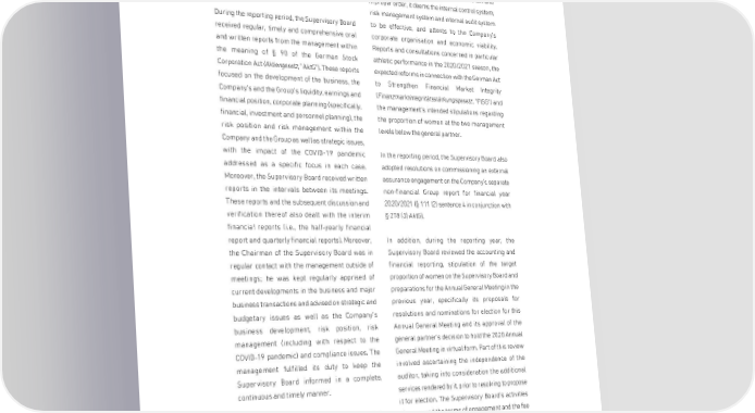 BORUSSIA DORTMUNDGmbH & Co. Kommanditgesellschaft auf Aktien, Dortmund relevant law. All issues are deliberated and all and deliberations formed a basis for this function. resolutions are passed by the full Supervisory Board; The Supervisory Board considers the management the Supervisory Board did not form any committees of the Company to be in compliance with the law and in the reporting year. in proper order, it deems the internal control system, risk management system and internal audit system During the reporting period, the Supervisory Board to be effective, and attests to the Company's received regular, timely and comprehensive oral corporate organisation and economic viability. and written reports from the management within Reports and consultations concerned in particular the meaning of § 90 of the German Stock athletic performance in the 2020/2021 season, the Corporation Act (Aktiengesetz, "AktG"). These reports expected reforms in connection with the German Act focused on the development of the business, the to Strengthen Financial Market Integrity Company's and the Group's liquidity, earnings and (Finanzmarktintegritätsstärkungsgesetz, "FISG") and financial position, corporate planning (specifically, the management's intended stipulations regarding financial, investment and personnel planning), the the proportion of women at the two management risk position and risk management within the levels below the general partner. Company and the Group as well as strategic issues, with the impact of the COVID-19 pandemic In the reporting period, the Supervisory Board also addressed as a specific focus in each case. adopted resolutions on commissioning an external Moreover, the Supervisory Board received written assurance engagement on the Company's separate reports in the intervals between its meetings. non-financial Group report for financial year These reports and the subsequent discussion and 2020/2021 (§ 111 (2) sentence 4 in conjunction with verification thereof also dealt with the interim § 278 (3) AktG). financial reports (i.e., the half-yearly financial report and quarterly financial reports). Moreover, In addition, during the reporting year, the the Chairman of the Supervisory Board was in Supervisory Board reviewed the accounting and regular contact with the management outside of financial reporting, stipulation of the target meetings; he was kept regularly apprised of proportion of women on the Supervisory Board and current developments in the business and major preparations for the Annual General Meeting in the business transactions and advised on strategic and previous year, specifically its proposals for budgetary issues as well as the Company's resolutions and nominations for election for this business development, risk position, risk Annual General Meeting and its approval of the management (including with respect to the general partner's decision to hold the 2020 Annual COVID-19 pandemic) and compliance issues. The General Meeting in virtual form. Part of this review management fulfilled its duty to keep the involved ascertaining the independence of the Supervisory Board informed in a complete, auditor, taking into consideration the additional continuous and timely manner. services rendered by it, prior to resolving to propose it for election. The Supervisory Board's activities The Supervisory Board advised and monitored the also covered the terms of engagement and the fee general partner and its managing directors on the agreement, the audit focal points and engaging the management of the Company. The reports of the auditor elected by the previous year's Annual management and the Supervisory Board's enquiries General Meeting. Anlage 1.4 / 10 41009653-1376911 10