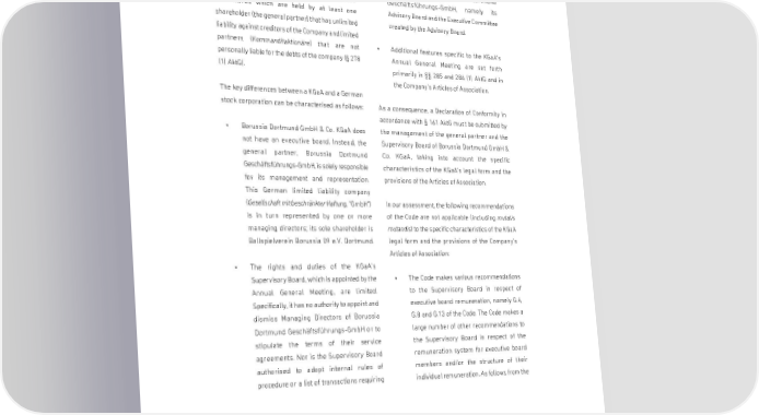 CORPORATE GOVERNANCE REPORTING A KGaA is a hybrid corporate form combining its consent on behalf of the general partner. elements of a German stock corporation and a Rather, such rights and duties are vested in limited partnership (Kommanditgesellschaft). It is a the governing bodies of Borussia Dortmund separate legal entity whose share capital is divided Geschäftsführungs-GmbH, namely its into shares which are held by at least one Advisory Board and the Executive Committee shareholder (the general partner) that has unlimited created by the Advisory Board. liability against creditors of the Company and limited partners (Kommanditaktionäre) that are not • Additional features specific to the KGaA's personally liable for the debts of the company (§278 Annual General Meeting are set forth (1) AktG). primarily in §§ 285 and 286 (1) AktG and in the Company's Articles of Association. The key differences between a KGaA and a German stock corporation can be characterised as follows: As a consequence, a Declaration of Conformity in accordance with § 161 AktG must be submitted by • Borussia Dortmund GmbH & Co. KGaA does the management of the general partner and the not have an executive board. Instead, the Supervisory Board of Borussia Dortmund GmbH & general partner, Borussia Dortmund Co. KGaA, taking into account the specific Geschäftsführungs-GmbH, is solely responsible characteristics of the KGaA's legal form and the for its management and representation. provisions of the Articles of Association. This German limited liability company (Gesellschaft mit beschränkter Haftung, "GmbH") In our assessment, the following recommendations is in turn represented by one or more of the Code are not applicable (including mutatis managing directors; its sole shareholder is mutandis) to the specific characteristics of the KGaA Ballspielverein Borussia 09 e.V. Dortmund. legal form and the provisions of the Company's Articles of Association: • The rights and duties of the KGaA's Supervisory Board, which is appointed by the • The Code makes various recommendations Annual General Meeting, are limited. to the Supervisory Board in respect of Specifically, it has no authority to appoint and executive board remuneration, namely G.4, dismiss Managing Directors of Borussia G.8 and G.13 of the Code. The Code makes a Dortmund Geschäftsführungs-GmbH or to large number of other recommendations to stipulate the terms of their service the Supervisory Board in respect of the agreements. Nor is the Supervisory Board remuneration system for executive board authorised to adopt internal rules of members and/or the structure of their procedure or a list of transactions requiring individual remuneration. As follows from the 41009653-1376911 Anlage 1.4 / 23 23