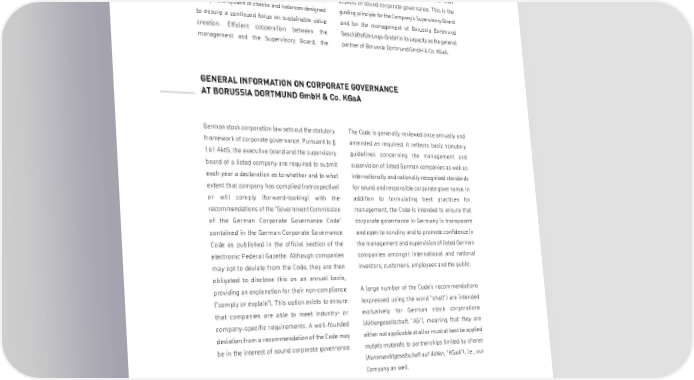 BORUSSIA DORTMUNDGmbH & Co. Kommanditgesellschaft auf Aktien, Dortmund CORPORATE GOVERNANCE REPORTING Our Company believes it is essential for corporate preservation of shareholder interests, and open and governance to be clearly structured and effective. transparent corporate communications are vital Corporate governance embodies a responsible and aspects of sound corporate governance. This is the transparent system of checks and balances designed guiding principle for the Company's Supervisory Board to ensure a continued focus on sustainable value and for the management of Borussia Dortmund creation. Efficient cooperation between the Geschäftsführungs-GmbH in its capacity as the general management and the Supervisory Board, the partner of Borussia Dortmund GmbH & Co. KGaA. GENERAL INFORMATION ON CORPORATE GOVERNANCE AT BORUSSIA DORTMUNDGmbH & Co. KGaA German stock corporation law sets out the statutory The Code is generally reviewed once annually and framework of corporate governance. Pursuant to § amended as required. It reflects basic statutory 161 AktG, the executive board and the supervisory guidelines concerning the management and board of a listed company are required to submit supervision of listed German companies as well as each year a declaration as to whether and to what internationally and nationally recognised standards extent that company has complied (retrospective) for sound and responsible corporate governance. In or will comply (forward-looking) with the addition to formulating best practices for recommendations of the "Government Commission management, the Code is intended to ensure that of the German Corporate Governance Code" corporate governance in Germany is transparent contained in the German Corporate Governance and open to scrutiny and to promote confidence in Code as published in the official section of the the management and supervision of listed German electronic Federal Gazette. Although companies companies amongst international and national may opt to deviate from the Code, they are then investors, customers, employees and the public. obligated to disclose this on an annual basis, providing an explanation for their non-compliance A large number of the Code's recommendations ("comply or explain"). This option exists to ensure (expressed using the word "shall") are intended that companies are able to meet industry- or exclusively for German stock corporations company-specific requirements. A well-founded (Aktiengesellschaft, "AG"), meaning that they are deviation from a recommendation of the Code may either not applicable at all or must at best be applied be in the interest of sound corporate governance. mutatis mutandis to partnerships limited by shares (Kommanditgesellschaft auf Aktien, "KGaA"), i.e., our Company as well. 22 Anlage 1.4 / 22 41009653-1376911
