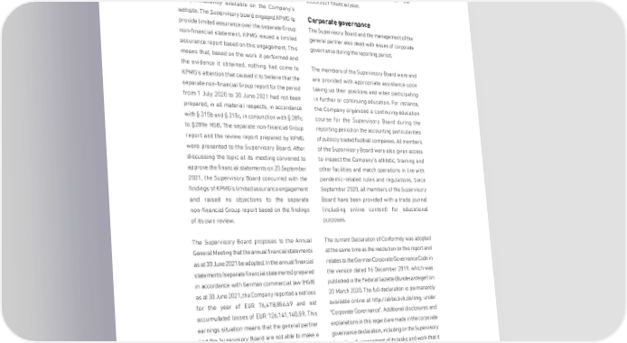BORUSSIA DORTMUNDGmbH & Co. Kommanditgesellschaft auf Aktien, Dortmund three preceding financial years, the general partner Moreover, the Supervisory Board proposes ratifying has chosen to prepare a separate non-financial the actions of the general partner, Borussia Group report pursuant to § 315b (3) HGB that is not Dortmund Geschäftsführungs-GmbH, for the part of the Group management report, and to make 2020/2021 financial year. this permanently available on the Company's website. The Supervisory board engaged KPMG to Corporate governance provide limited assurance over the separate Group The Supervisory Board and the management of the non-financial statement. KPMG issued a limited general partner also dealt with issues of corporate assurance report based on this engagement. This governance during the reporting period. means that, based on the work it performed and the evidence it obtained, nothing had come to The members of the Supervisory Board were and KPMG's attention that caused it to believe that the are provided with appropriate assistance upon separate non-financial Group report for the period taking up their positions and when participating from 1 July 2020 to 30 June 2021 had not been in further or continuing education. For instance, prepared, in all material respects, in accordance the Company organised a continuing education with § 315b and § 315c, in conjunction with § 289c course for the Supervisory Board during the to §289e HGB. The separate non-financial Group reporting period on the accounting particularities report and the review report prepared by KPMG of publicly traded football companies. All members were presented to the Supervisory Board. After of the Supervisory Board were also given access discussing the topic at its meeting convened to to inspect the Company's athletic, training and approve the financial statements on 20 September other facilities and match operations in line with 2021, the Supervisory Board concurred with the pandemic-related rules and regulations. Since findings of KPMG's limited assurance engagement September 2020, all members of the Supervisory and raised no objections to the separate Board have been provided with a trade journal non-financial Group report based on the findings (including online content) for educational of its own review. purposes. The Supervisory Board proposes to the Annual The current Declaration of Conformity was adopted General Meeting that the annual financial statements at the same time as the resolution on this report and as at 30 June 2021 be adopted. In the annual financial relates to the German Corporate Governance Code in statements (separate financial statements) prepared the version dated 16 December 2019, which was in accordance with German commercial law (HGB) published in the Federal Gazette (Bundesanzeiger) on as at 30 June 2021, the Company reported a net loss 20 March 2020. The full declaration is permanently for the year of EUR 76,478,856.69 and net available online at http://aktie.bvb.de/eng, under accumulated losses of EUR 126,141,140.59. This "Corporate Governance". Additional disclosures and earnings situation means that the general partner explanations in this regard are made in the corporate and the Supervisory Board are not able to make a governance declaration, including on the Supervisory proposal to the Annual General Meeting on the Board's self-assessment of its tasks and work that it appropriation of net profit, or to recommend that it conducted in the reporting year. resolve to distribute a dividend. Anlage 1.4 / 12 41009653-1376911 12