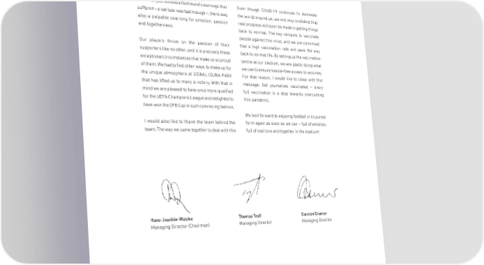 INTRODUCTORY REMARKS Dear Shareholders, The pandemic continues to pervade all aspects of situation was impressive. Separated as we often our daily lives, and it is also taking its toll on are by remote working, we have nevertheless all professional football. The past financial year was closed ranks to overcome the crisis. marked by empty terraces and an eerie silence. It was not just Borussia Dortmund's earnings that Even though COVID-19 continues to dominate suffered – a net loss was bad enough –, there was the world around us, we are very confident that also a palpable yearning for emotion, passion real progress will soon be made in getting things and togetherness. back to normal. The key remains to vaccinate people against this virus, and we are convinced Our players thrive on the passion of their that a high vaccination rate will pave the way supporters like no other, and it is precisely these back to normal life. By setting up the vaccination exceptional circumstances that make us so proud centre at our stadium, we are gladly doing what of them. We had to find other ways to make up for we can to ensure hassle-free access to vaccines. the unique atmosphere at SIGNAL IDUNA PARK For that reason, I would like to close with this that has lifted us to many a victory. With that in message: Get yourselves vaccinated – every mind we are pleased to have once more qualified full vaccination is a step towards overcoming for the UEFA Champions League and delighted to this pandemic. have won the DFB Cup in such convincing fashion. We look forward to enjoying football in its purest I would also like to thank the team behind the form again as soon as we can – full of emotion, team. The way we came together to deal with this full of real love and together in the stadium! Hans-Joachim Watzke Thomas Treß Carsten Cramer Managing Director (Chairman) Managing Director Managing Director